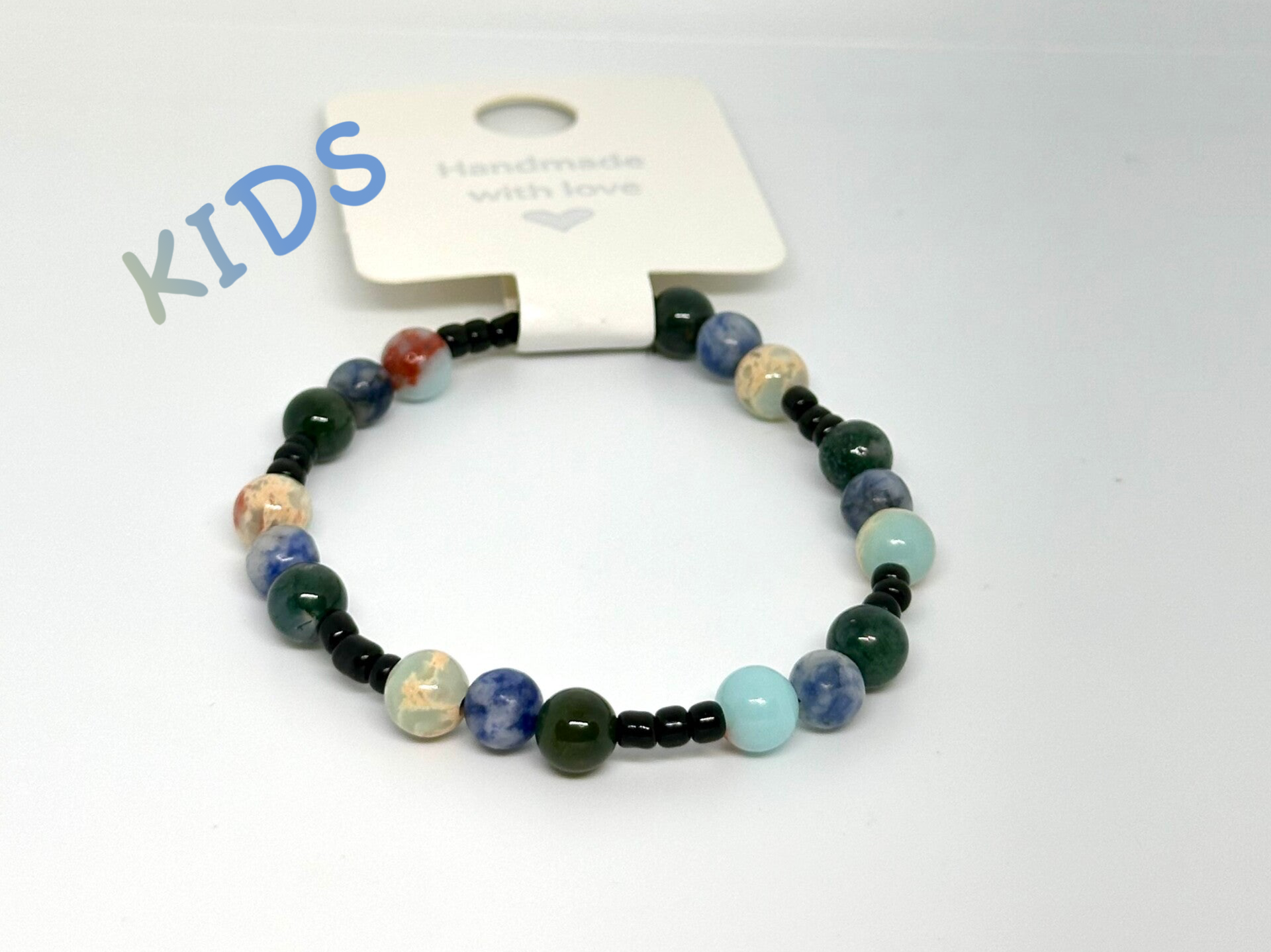 Bracelet élastique en perle de rocaille et pierre naturelle jaspe, agathe et sodalite. Taille 14cm.
