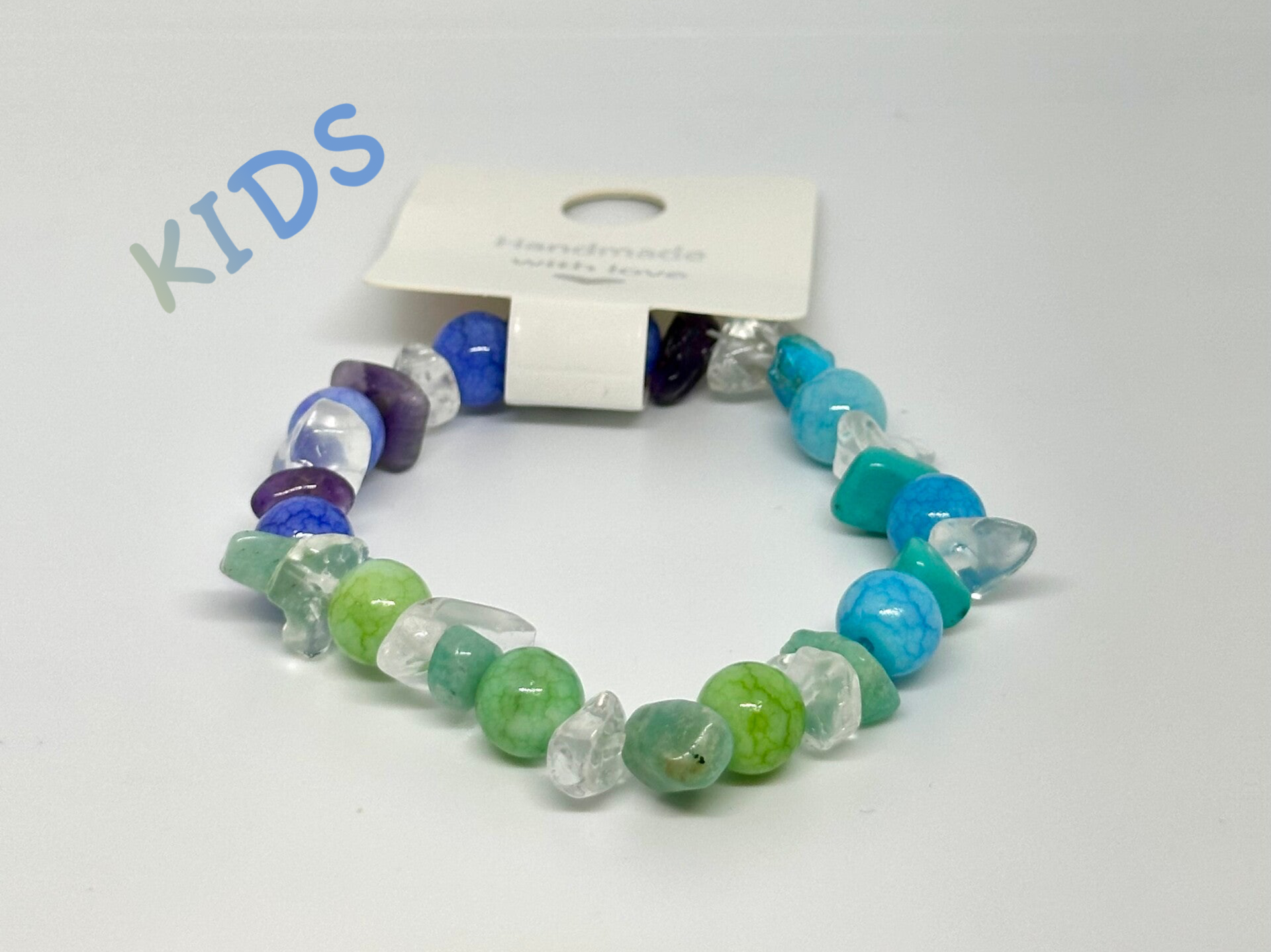 Bracelet élastique en perle de verre et pierre naturelle Crystal de roche, améthyste, amazonite, turquoise. Taille 14cm.