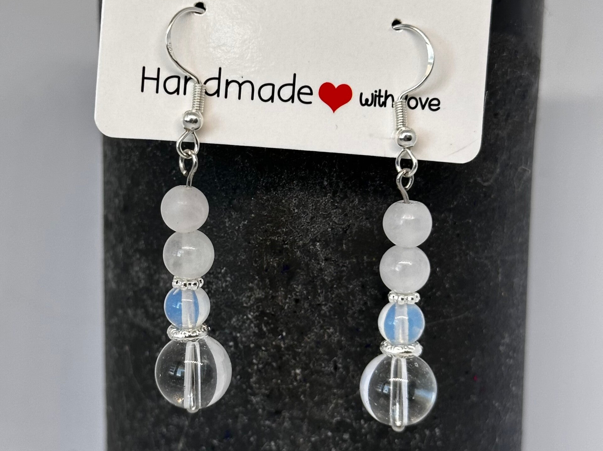 Boucle plaquée argent. Quartz, pierre de lune, opalite (6mm) et perle de verre (8mm).